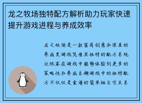 龙之牧场独特配方解析助力玩家快速提升游戏进程与养成效率
